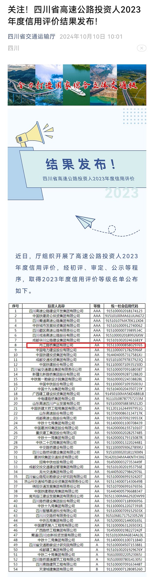 10月10日,四川省交通運輸廳正式發(fā)布公告,內(nèi)江路橋集團有限公司(以下簡稱“內(nèi)江路橋集團”)成為內(nèi)江市唯一獲評四川省高速公路投資人2023年度信用評價等級AA級企業(yè)。這是繼2020年首次獲評該等級后,連續(xù)第四年蟬聯(lián)AA等級。