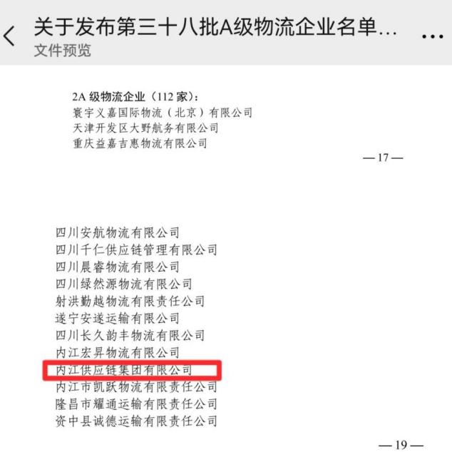全國(guó)A級(jí)物流企業(yè)是我國(guó)物流領(lǐng)域最具權(quán)威的資質(zhì)認(rèn)定,近日全國(guó)第三十八批次A級(jí)物流企業(yè)結(jié)果名單揭曉,內(nèi)江路橋集團(tuán)下屬企業(yè)內(nèi)江供應(yīng)鏈集團(tuán)有限公司進(jìn)入榜單之列,被中國(guó)物流與采購(gòu)聯(lián)合會(huì)授予“國(guó)家2A級(jí)物流企業(yè)”稱號(hào)